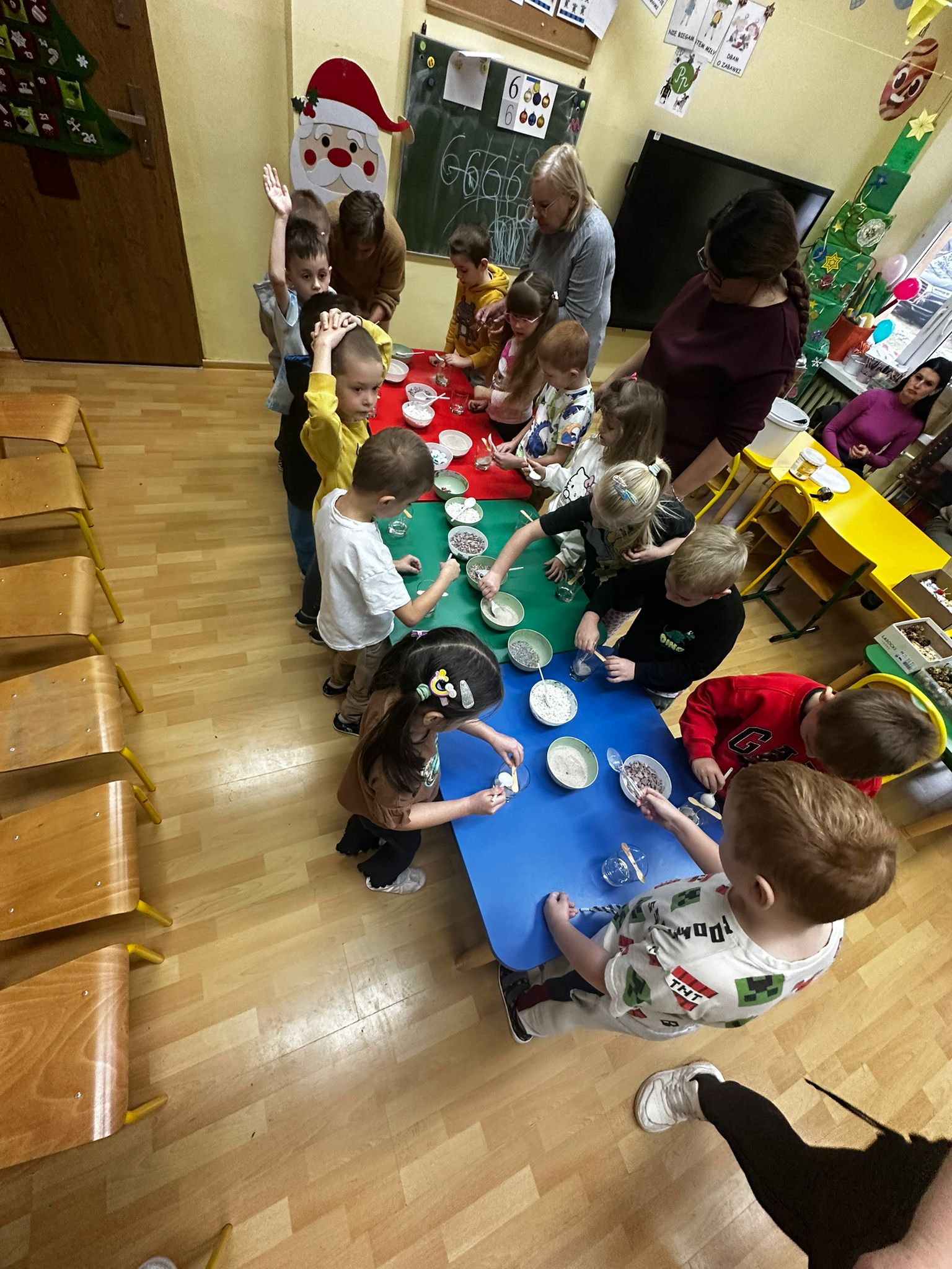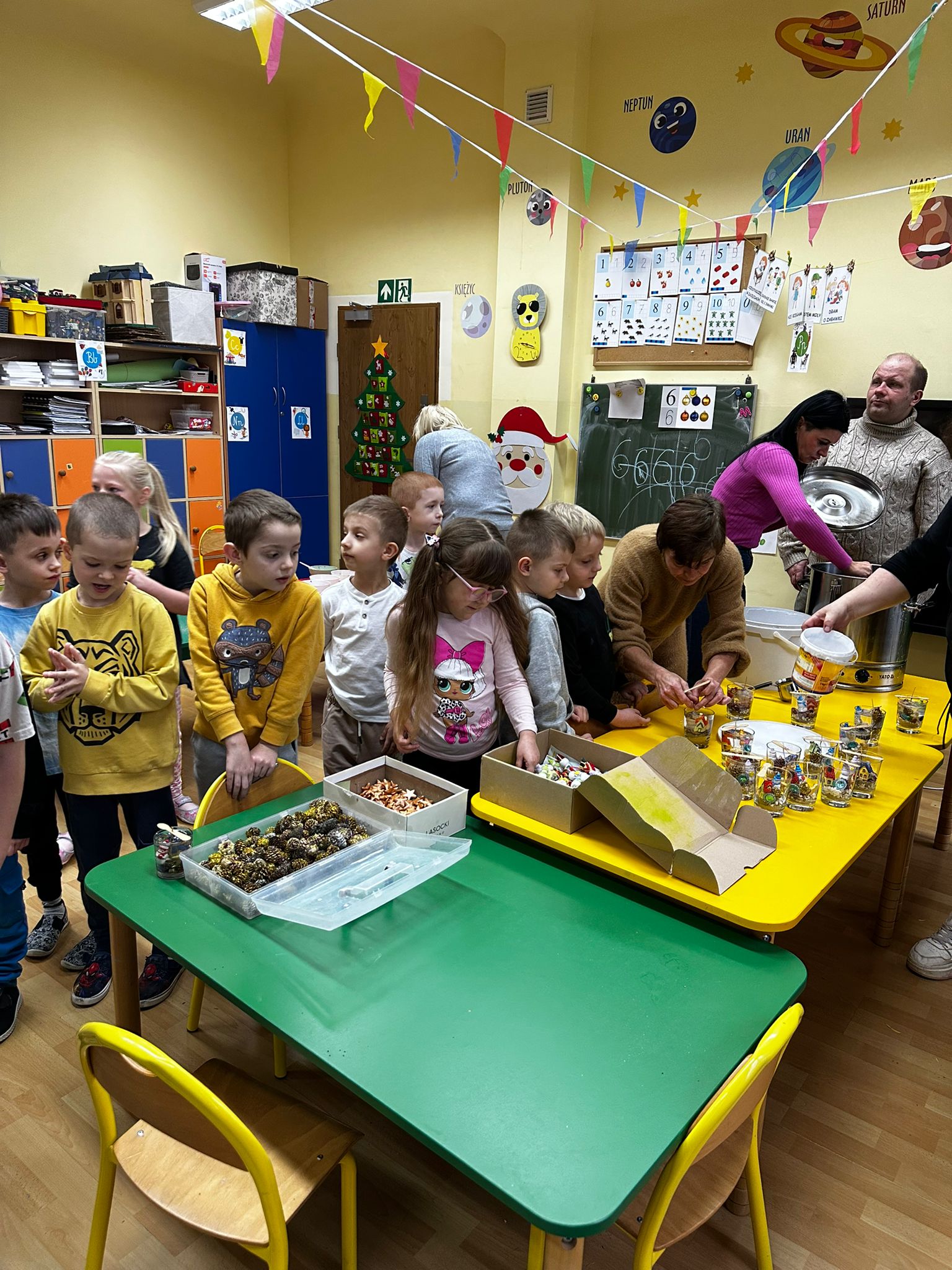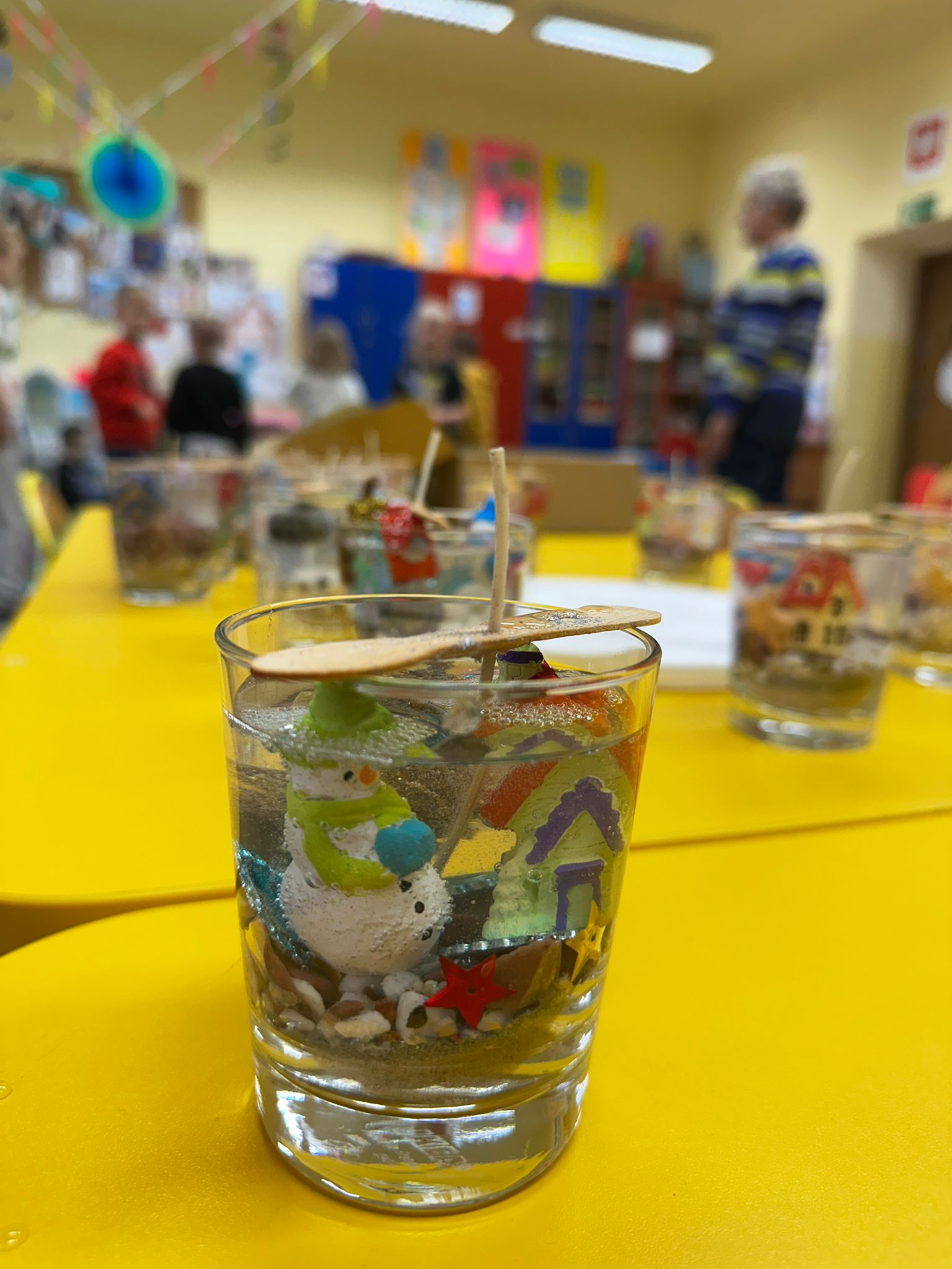 2 grudnia odwiedziły nas panie z Zakładu Aktywności Zawodowej z Witowic. Dzieci bardzo się cieszyły, że mogły uczestniczyć w warsztatach plastycznych. Zerówkowicze wykazały się ogromną kre aktywnością i pomysłowością, ich świece żelowe wyszły naprawdę przepiękne. Największą radością było zobaczyć, jak wiele uśmiechu i satysfakcji sprawiło im samodzielne, własnoręczne tworzenie świątecznej świecy.