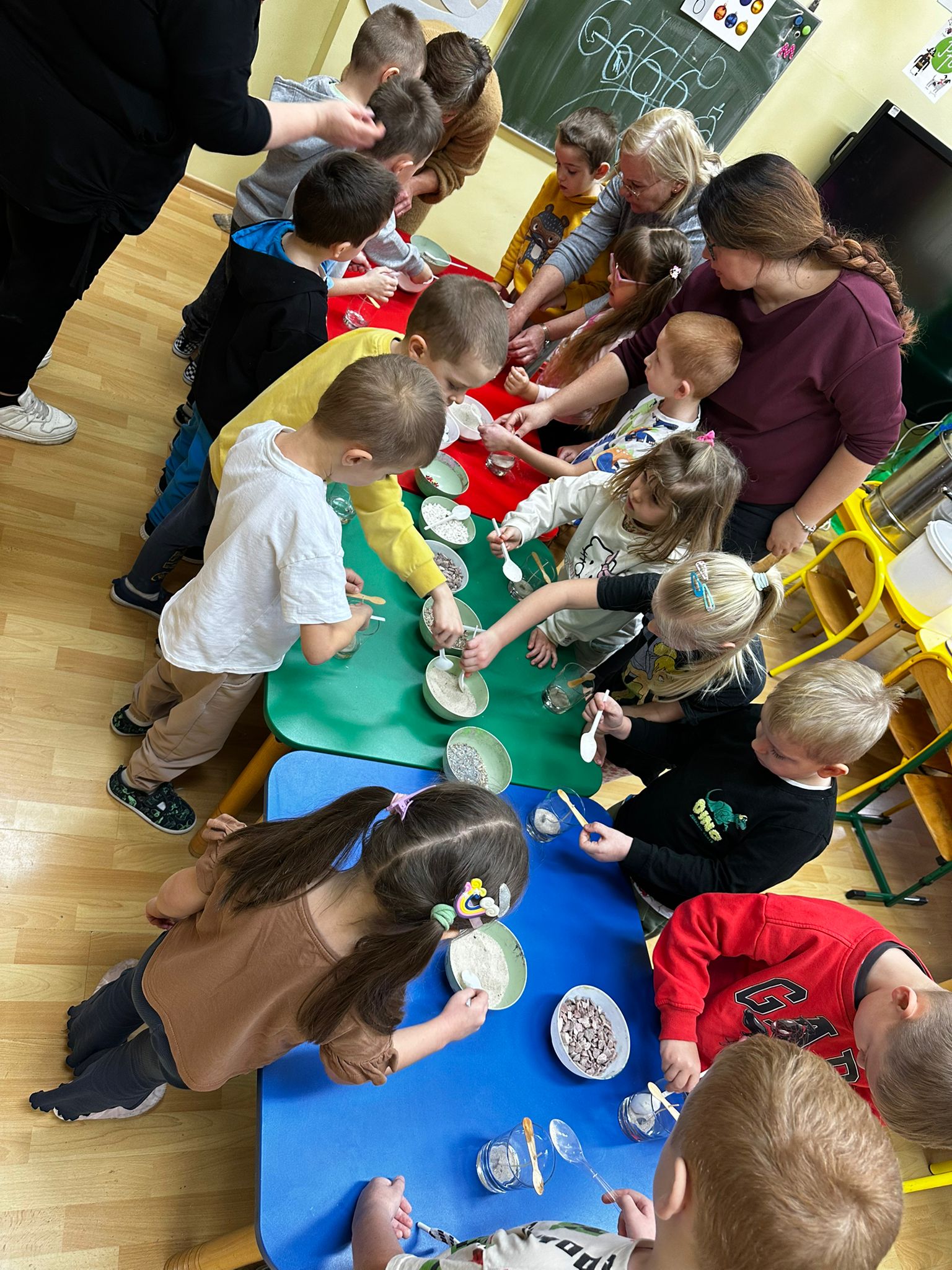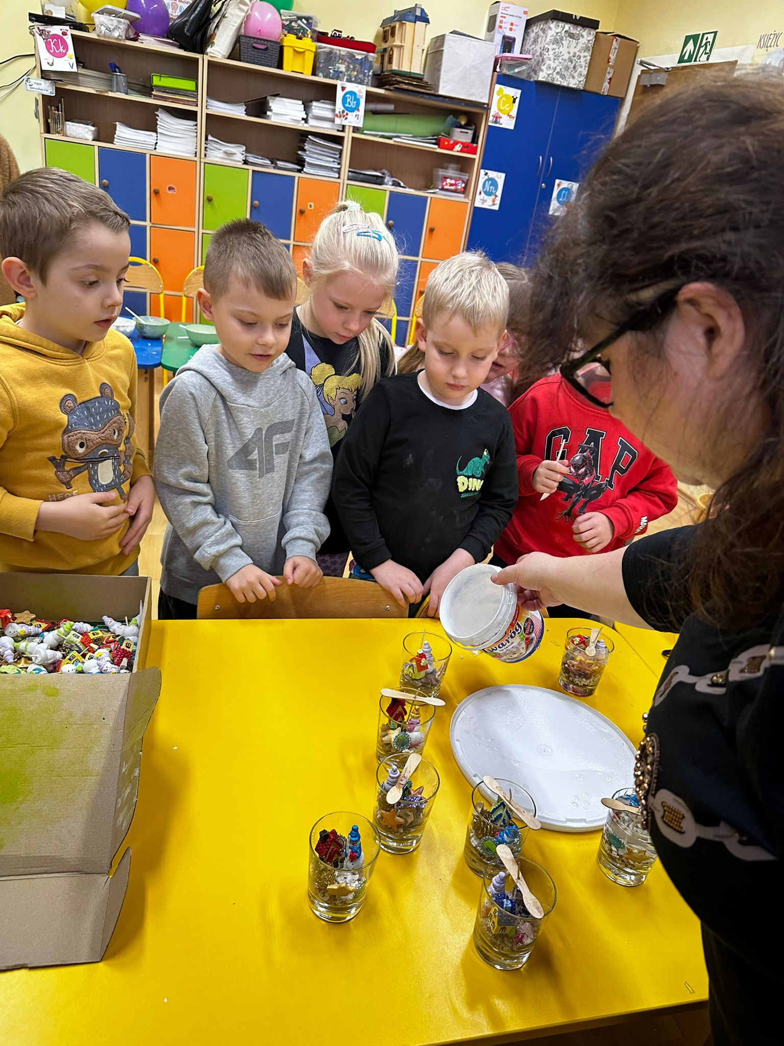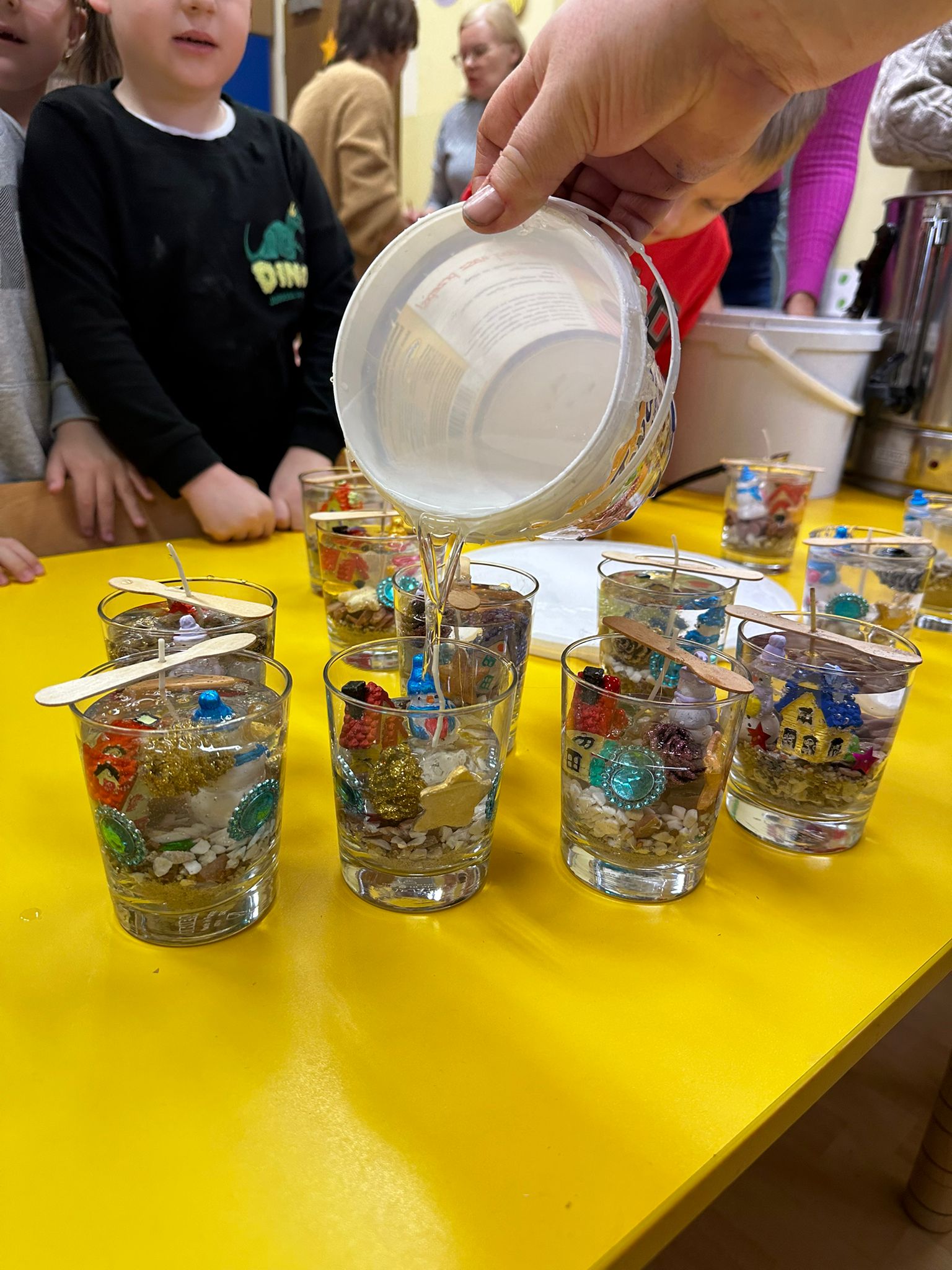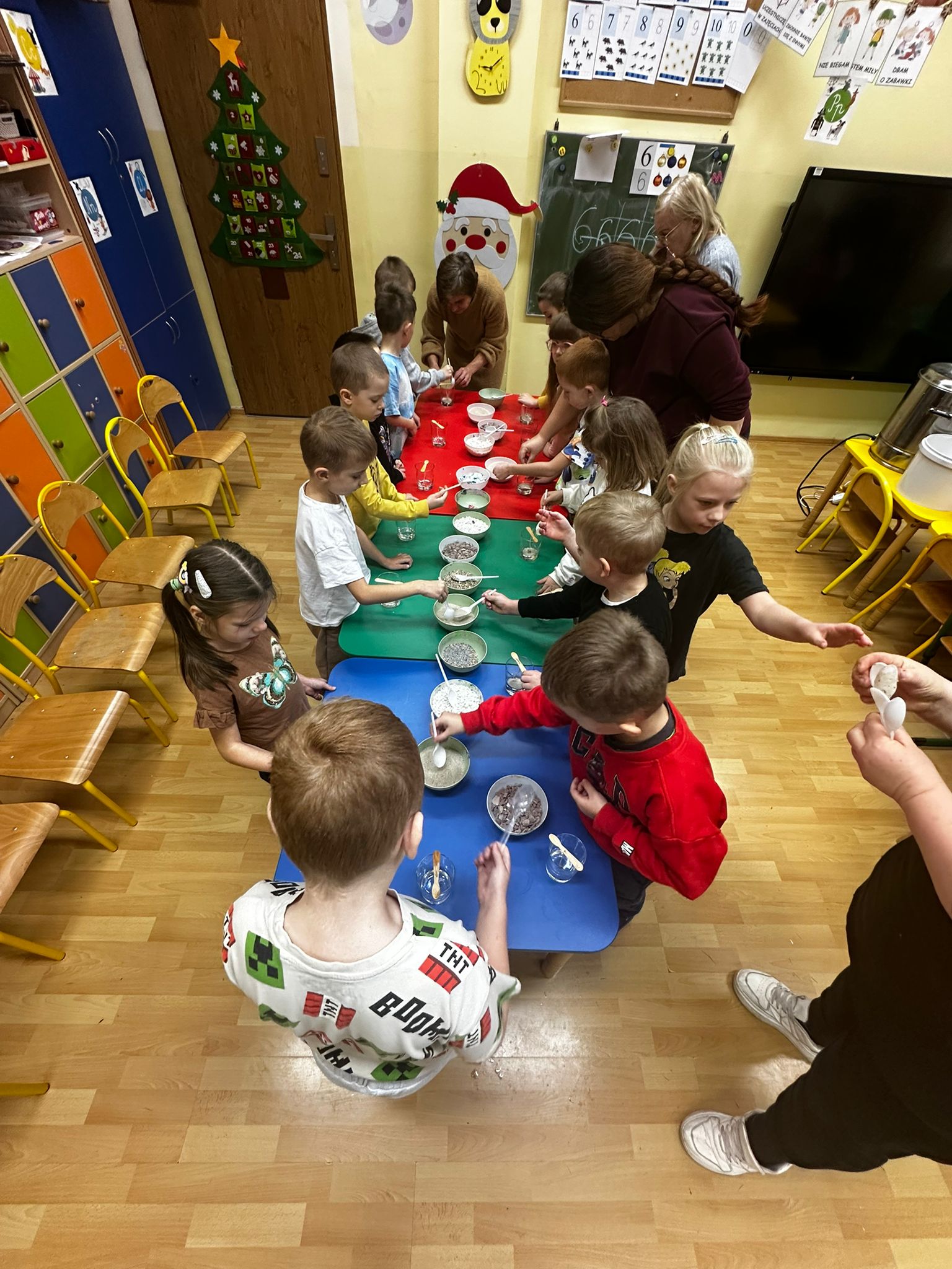 2 grudnia odwiedziły nas panie z Zakładu Aktywności Zawodowej z Witowic. Dzieci bardzo się cieszyły, że mogły uczestniczyć w warsztatach plastycznych. Zerówkowicze wykazały się ogromną kre aktywnością i pomysłowością, ich świece żelowe wyszły naprawdę przepiękne. Największą radością było zobaczyć, jak wiele uśmiechu i satysfakcji sprawiło im samodzielne, własnoręczne tworzenie świątecznej świecy.
