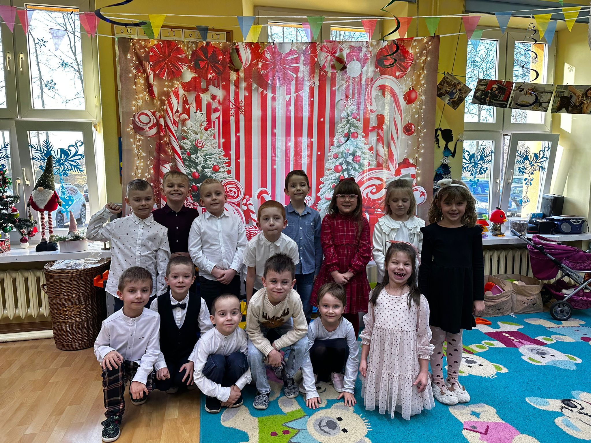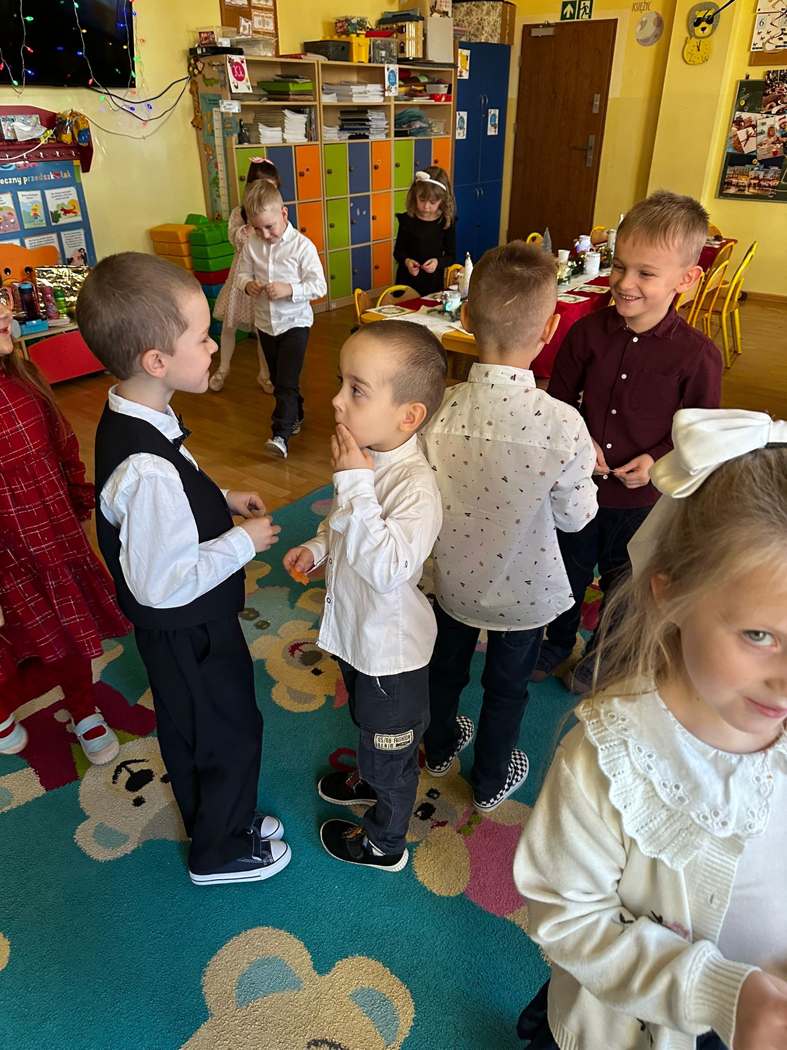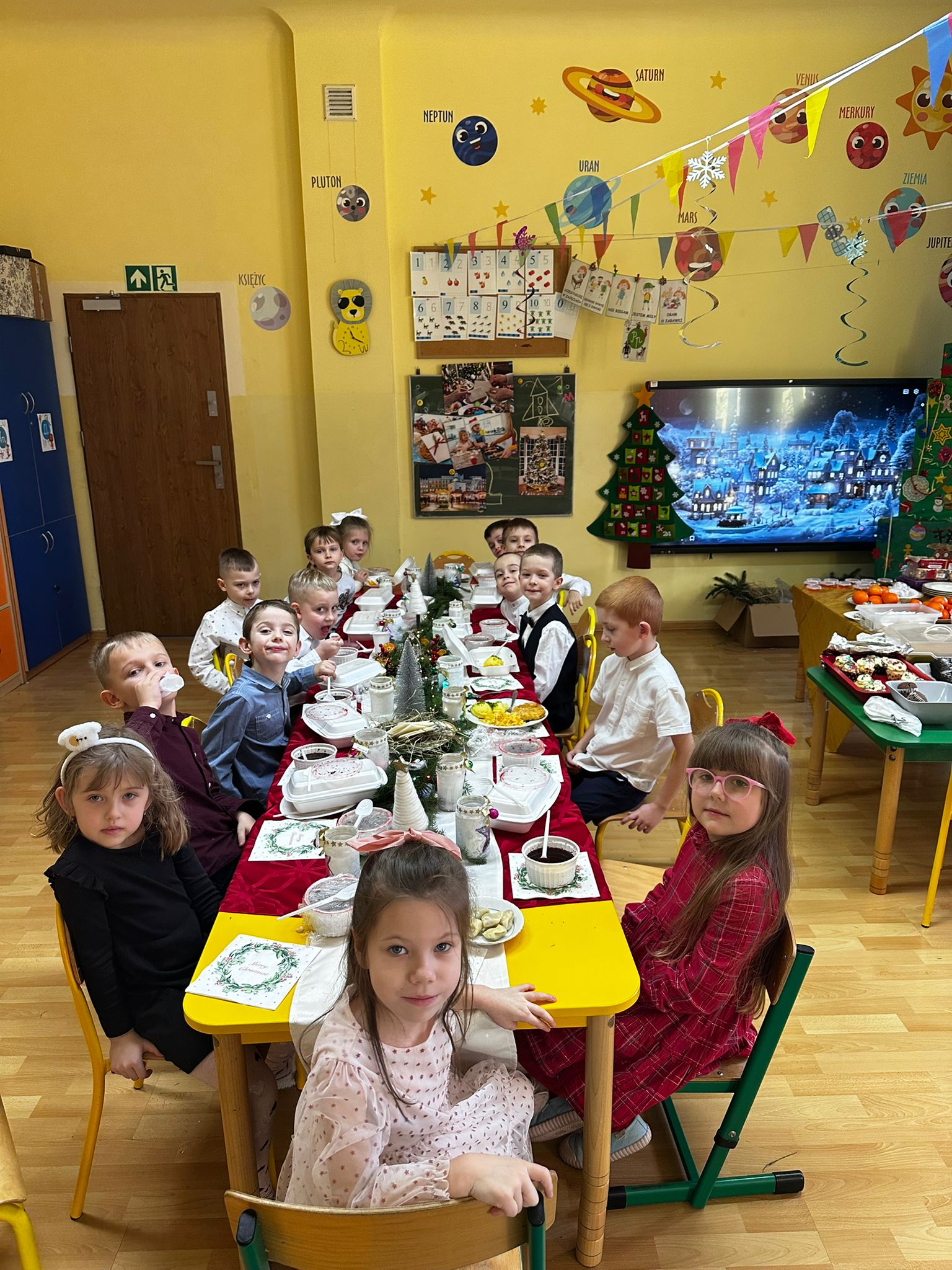 18 grudnia odbyło się spotkanie wigilijne. Sala została udekorowana świątecznymi ozdobami i choinką, co wprowadziło dzieci w radosny, bożonarodzeniowy nastrój. Dzieci poznały tradycje związane z Wigilią, wspólnie śpiewały kolędy oraz składały sobie świąteczne życzenia. Spotkanie zakończyło się wspólnym poczęstunkiem. Wigilia była czasem radości, integracji oraz kultywowania tradycji świątecznych.