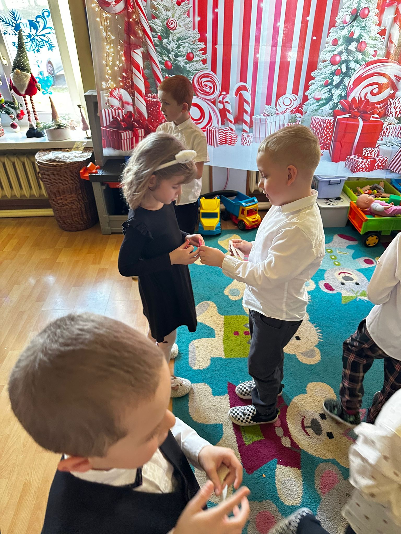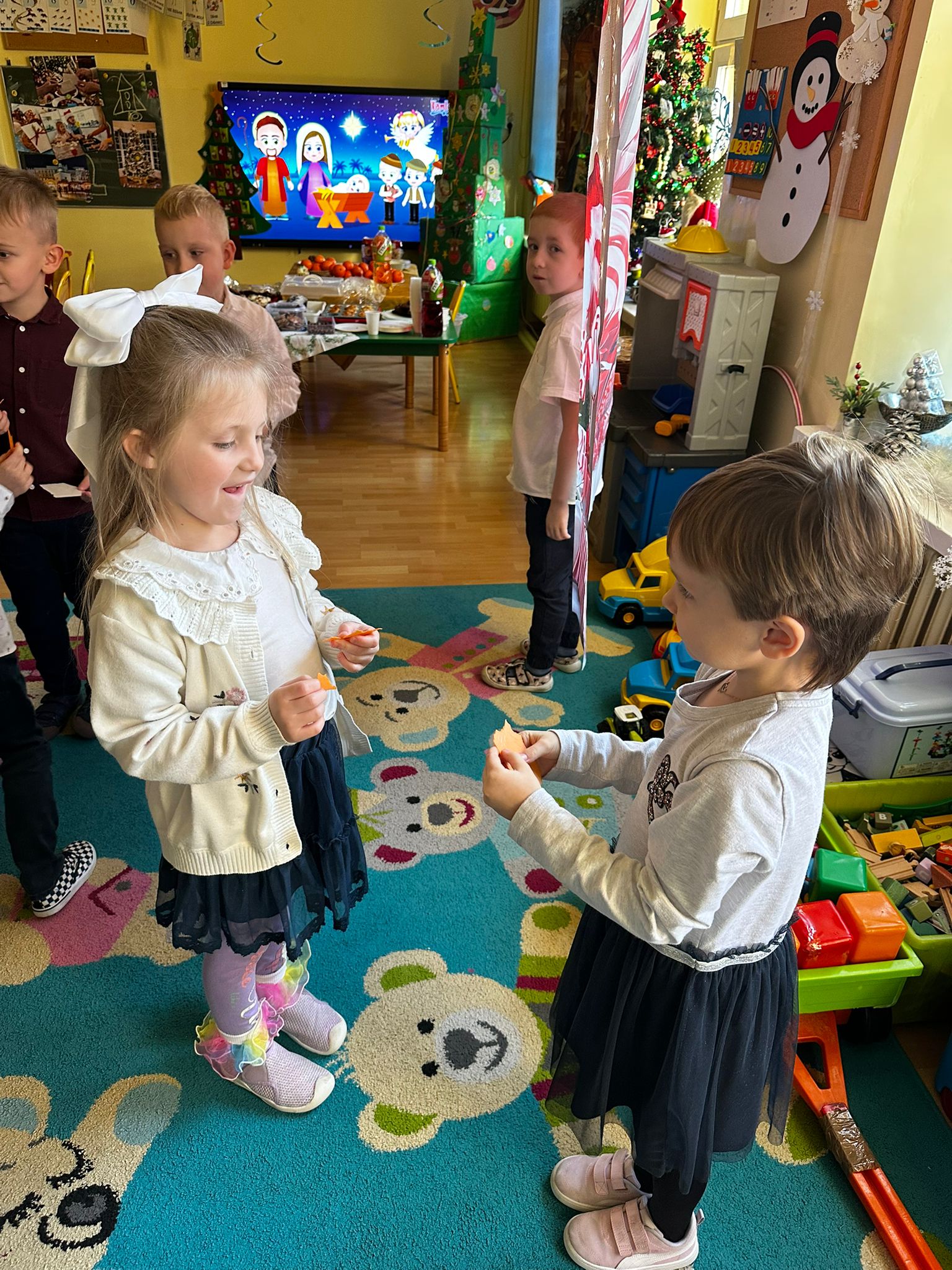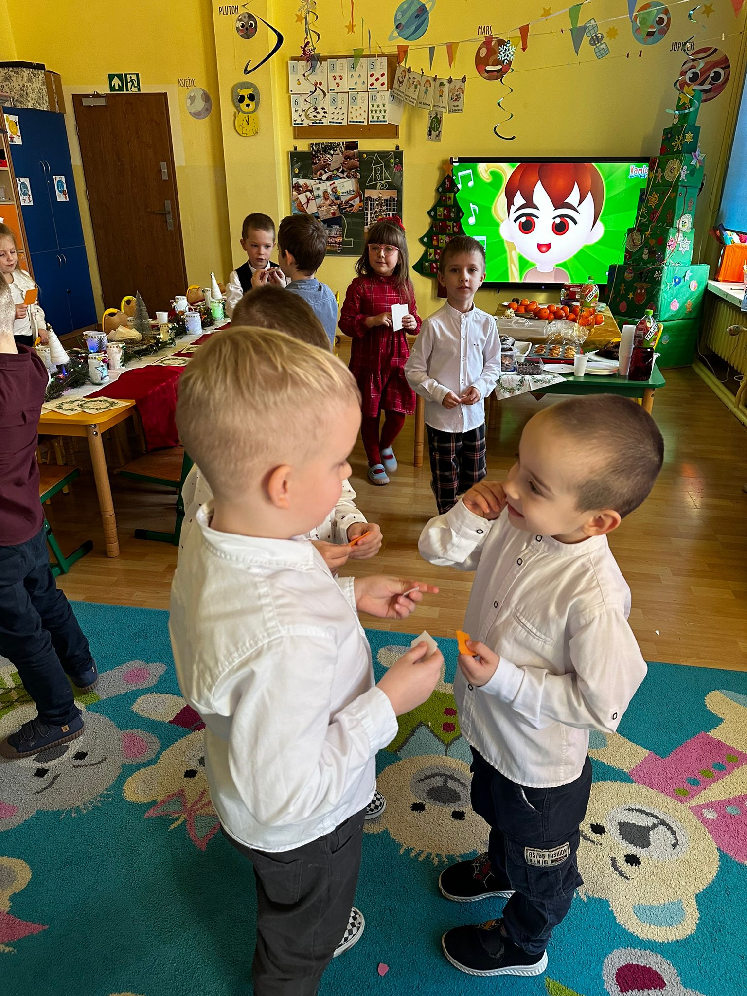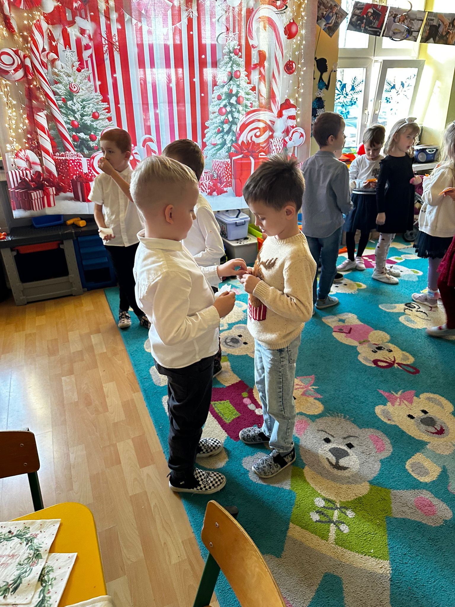18 grudnia odbyło się spotkanie wigilijne. Sala została udekorowana świątecznymi ozdobami i choinką, co wprowadziło dzieci w radosny, bożonarodzeniowy nastrój. Dzieci poznały tradycje związane z Wigilią, wspólnie śpiewały kolędy oraz składały sobie świąteczne życzenia. Spotkanie zakończyło się wspólnym poczęstunkiem. Wigilia była czasem radości, integracji oraz kultywowania tradycji świątecznych.