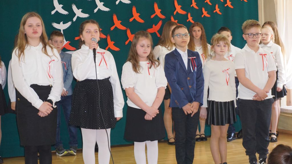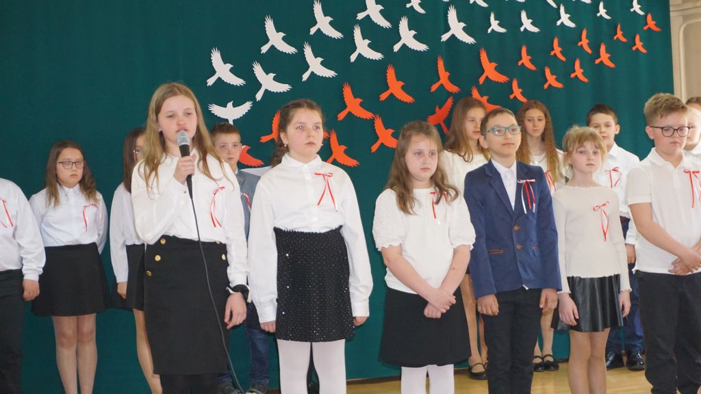 Niezwykle wzruszającym elementem uroczystości była oprawa muzyczna. Pod czujnym okiem pana Mariusza Oleksa, który przygotował uczniów pod kątem śpiewu, cala sala wybrzmiała radosnymi pieśniami patriotycznymi. Wspólne wykonanie „Roty” stało się kulminacyjnym punktem programu.